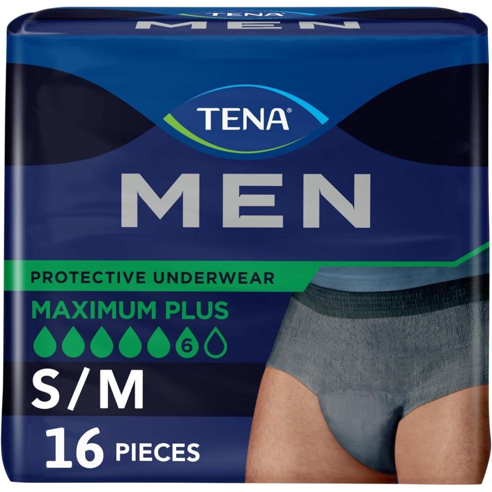 TENA Men Maximum Plus Incontinence Underwear, Bladder Control, S/M, 64 Count (Waist size 34in-50in)(Small/Medium)