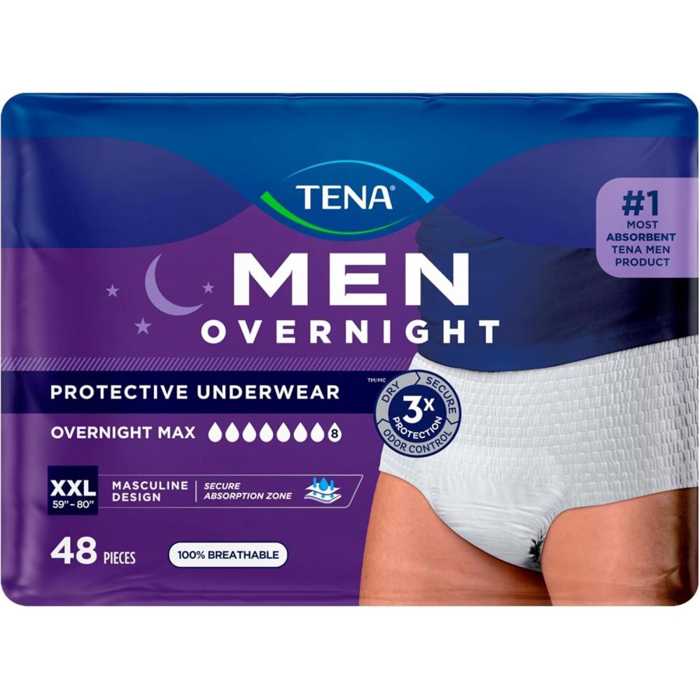 TENA Men Overnight Extra Coverage Underwear for bladder control, Masculine, Discreet, L/XL, 48 Count (Waist size 44in-64in)(Small/Medium)